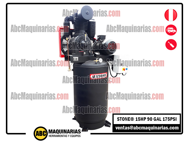 Compresor eléctrico de doble etapa STONE® con cabezal de fierro fundido, motor WEG® de alta eficiencia IP55.