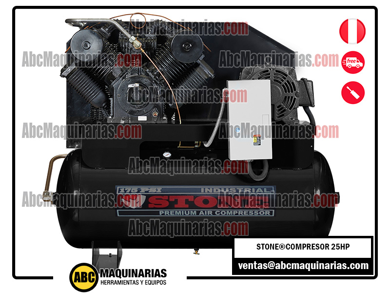 Compresor eléctrico de doble etapa STONE® con cabezal de fierro fundido, motor WEG® de alta eficiencia IP55.